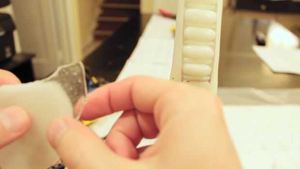 Usar unos ½ TB de plástico blanda de polly, rollo en sus manos como un gusano de pasta juego de vieja escuela y Envuélvala alrededor de la hoja. Lisa, Púlselo para dar una agradable forma cónica Lisa a justo por encima del rectángulo acanalado en el mango.