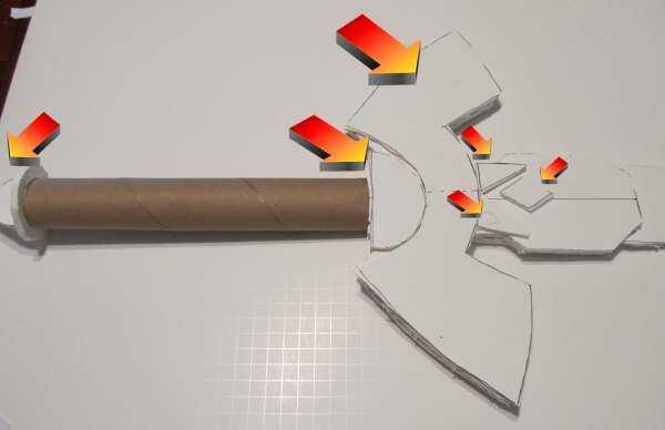 Ahora solo tienes que pegar las piezas restantes. Hay cinco piezas individuales y el conjunto de dos partes que constituye el extremo de la manija de la espada.