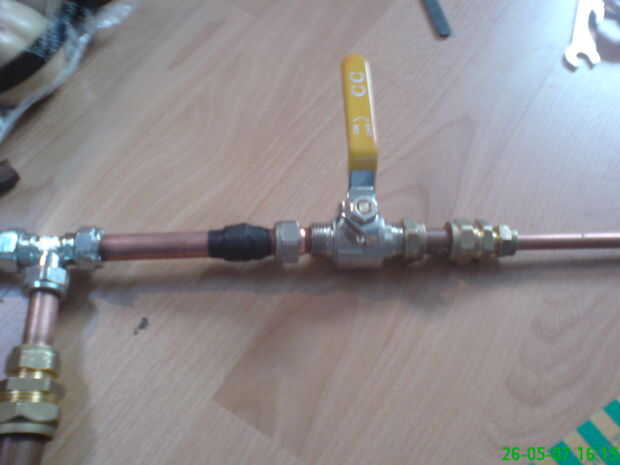 añadir el tanque de compresión en la parte inferior del tee y el cañón en el tubo más grande en el tee para que el mango quede hacia arriba.