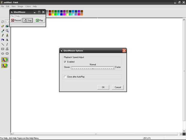 Abra su herramienta de editor/dibujo de imagen preferida (MS Paint funciona bien) y escoge su fondo de color (con el cubo) luego saca el lápiz y elegir su color. En ratón fantasma, vaya a archivo -> Opciones y activar "Ajuste de velocidad de reproducción" y ponerlo tan alto como puedas. Haga clic en reproducir y ver que dibujar la imagen.