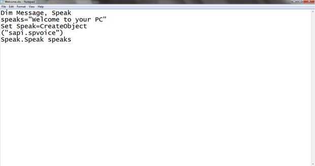 Esta casi lo mismo, pero con este programa no puede introducir el texto que usted quiere decir. Ahora probablemente vas: oh, eso es aburrido. Pero lo es si pones este archivo en la carpeta C:\Users\{user-name}\AppData\Roaming\Microsoft\Windows\Start Menu\Programs\Startup que juega cada vez que arranque su ordenador. Cada vez que inicie el ordenador dirá Bienvenido. No que fresco :-)