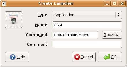 Puede descargar un Paquete deb de aquí instalar haciendo doble clic en el deb descargado. Ahora yo puede iniciar CAM escribiendo "circular-main-menu" en su Terminal. También puede crear un motor de arranque en el panel como gimmie ha agregado a su panel. pero esta vez le don´t click gimmie pero "Custom aplicación arranque". Rellenar como se muestra en la imagen 2.