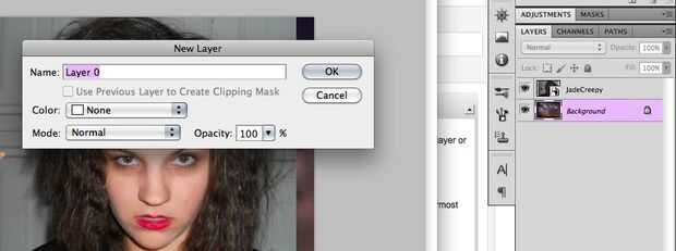 2. desbloquear la primera capa haciendo doble clic sobre la palabra 'fondo' . Un cuadro de diálogo se abra y haga clic en 'entrar' . Esto cambiará el nombre de la capa de fondo a la capa 0. (ver imágenes 1-3)