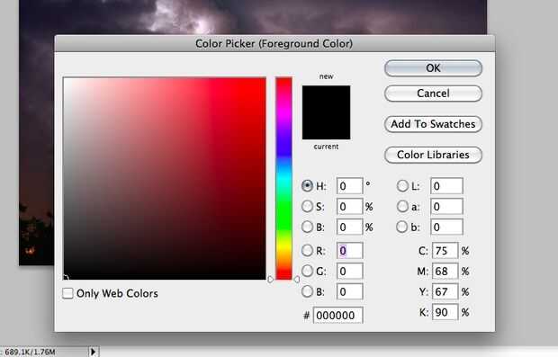 4. Asegúrese de que estén pintando con el color negro . Usted puede mirar para ver qué color se están pintando con mirando a la esquina inferior izquierda de la pantalla. Haga doble clic en el cuadrado de color para abrir el selector de color negro. (ver imagen 4 y 5)