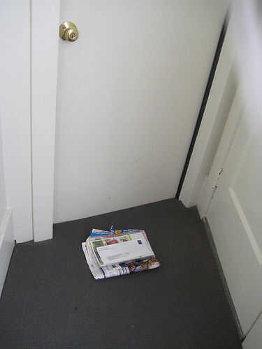 -Para los apartamentos que no tienen buzones de correo accesibles o abiertos, coloque el correo delante de la puerta al apartamento de su vecino. Si hay una placa que usted no puede conseguir a través, coloque justo en frente de esa puerta. Si usted puede acceder a la puerta del apartamento interno de su vecino, luego ponerlo delante de esa puerta.
