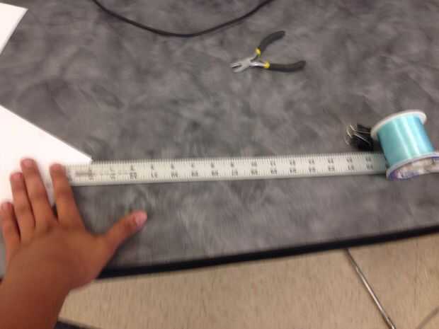 Mida y corte de 14 pulgadas de la línea de pesca. El objetivo previsto es que al menos un pie de sedal porque necesita atar ambos extremos de la línea de pesca a los clips de papel, y que requerirá un poco más de sedal. El músculo será aproximadamente el 20% de la longitud original porque se reducirá ya que las bobinas.