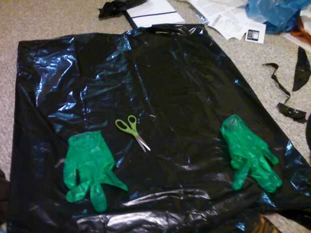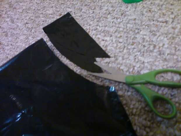 Para la parte superior hice un corte en la otra bolsa de sólo lo suficientemente grande como mi cabeza se deslice a través. En este punto me di cuenta que necesitaba acceso a mano, pero no quería que mis brazos mostrando. Después de un poco de esfuerzo mental encontré que es mejor cortar los agujeros de la mano en la parte frontal de la parte superior y luego a lo largo de los lados. Simplemente corte una X y empujó mi mano enguantada a través de él. Fui con mano nivel áspero timbre botón, pasando la idea que pondría más "flagelos" en mi cabeza y los pies.