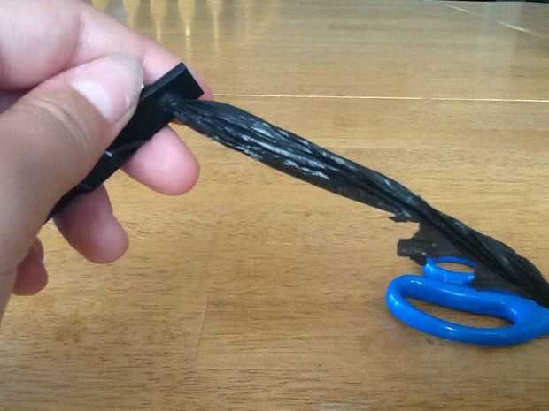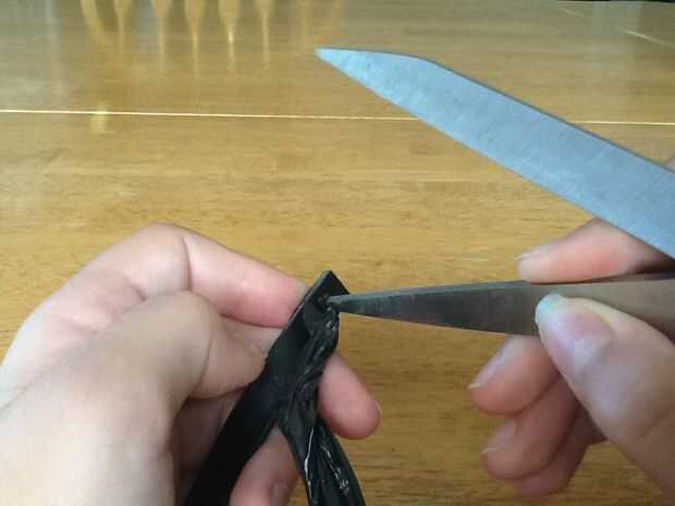 Ahora todo lo que tienes que hacer es poner tu cadena o cinta por los dos agujeros. Si tiene algunos problemas para hacerlo, utilice la punta de su tijera para empujar la cadena o cinta por los agujeros.