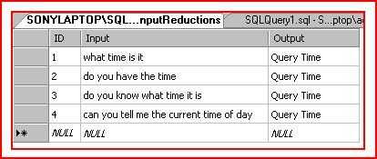Puede haber cien maneras diferentes a la AI la pregunta misma. Por ejemplo; "¿Qué hora es?", "¿tiene el tiempo?" "¿Sabe usted qué hora es?", "Usted me puede decir la hora del día?" Puesto que el usuario sólo está pidiendo el tiempo, convertir cualquiera de estas entradas a una sola salida llamado "Pregunta tiempo" usando una tabla de base de datos "ver".