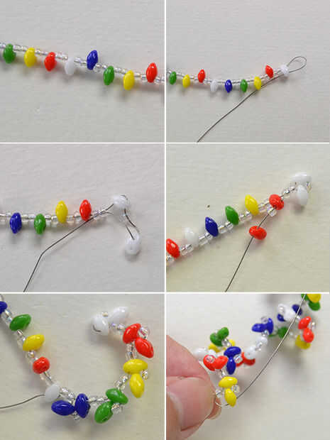 1 º cortar una parte de cola de tigre de 0,3 mm. Entonces, granos de la semilla claro hilo 2, un grano de semilla 2-agujero de 5x3.5x3mm amarillo, 2 rocallas claro, un rojo de 2 agujeros de semillas de bolas, 2 rocallas claro, un grano de semilla blanca de 2 agujeros, 2 rocallas claro, un grano de semilla 2-agujero azul, 2 granos de la semilla claro, un verde de 2 agujeros de semillas de bolas en secuencia a la cola del tigre. Repita este paso cinco veces. Entonces, granos de la semilla 2 hilo de rosca, un grano de semilla amarilla de 2 agujeros, 2 rocallas claro, un rojo de 2 agujeros de semillas de bolas, 2 rocallas claro y una blanca 2 agujeros de semillas de bolas (como se muestra en la imagen);