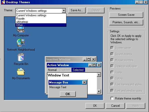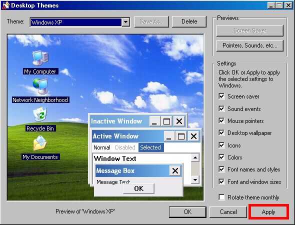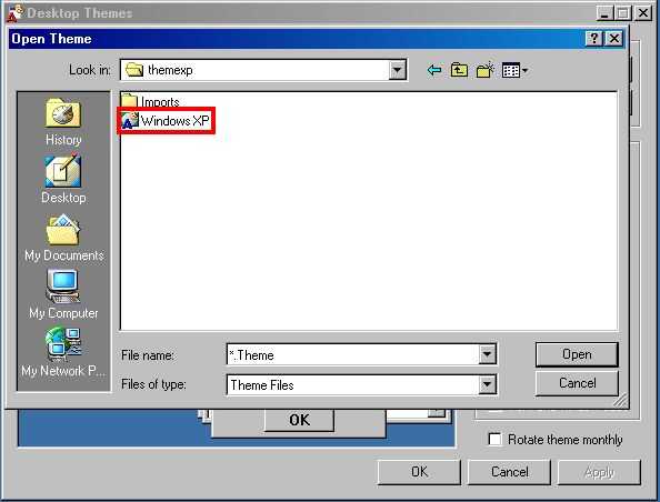 Bien, ahora tienes que hacer. Ir a "temas de escritorio". La carpeta debe estar en su panel de control. Si no, busque en "Buscar," en el menú de inicio. Está en su computadora algunos donde. Una vez que lo hayas encontrado, abren. Siguiente haga clic en, "otro," en el menú desplegable. Desplácese a la ubicación C:/themexp. Abra la carpeta y buscar el archivo, haga clic en "Windows XP.theme" en él y abrirlo. Asegúrese de que estén marcadas todas las casillas de verificación en el panel derecho. Ahora haga clic en aplicar. Esto ha establecer el siguiente paso en el proceso.