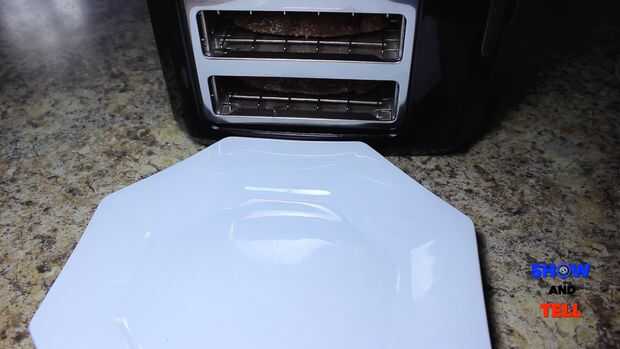 Colocar el plato delante de la tostadora para coger su emparedado de queso a la plancha.
