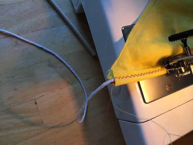 Fijar el cable a lo largo del borde doblado de la tira de triángulos (colgando aproximadamente 1 pie a cada lado). A continuación, doblar el borde doblado de la tira apenas con el cable (aproximadamente 1/2 pulgada). Por último, con una puntada zig-zag, coser el cordón en su lugar.