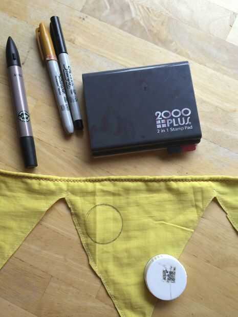 Sus banderas de queso estén casi hechas pero hay una cosa más que hacer: decorar! Para que se vean más como el emblemático queso, encontrar una tapa de repuesto botella (aproximadamente 1 pulgada de diámetro) y una almohadilla de tinta negra. Tinta de la tapa (la parte inferior de la tapa, no la parte superior) y luego presione al azar en el tejido (incluyendo en los bordes). Asegúrese de no imprimir muchos círculos.