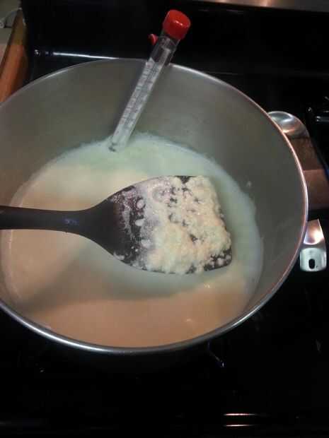 Mantener un ojo en la mezcla de queso y una vez esa lectura hits 175F cortar el calor y dejar enfriar sin perturbaciones durante unos 10 minutos. Tenga en cuenta que tuve que cambiar un pañal de poopy y mi leche casi llegamos hasta 200F, por lo que el proceso puede ser indulgente. Recuerde sin embargo, el objetivo es 175F (75C). En este punto debería ser fácil distinguir la cuajada del suero.