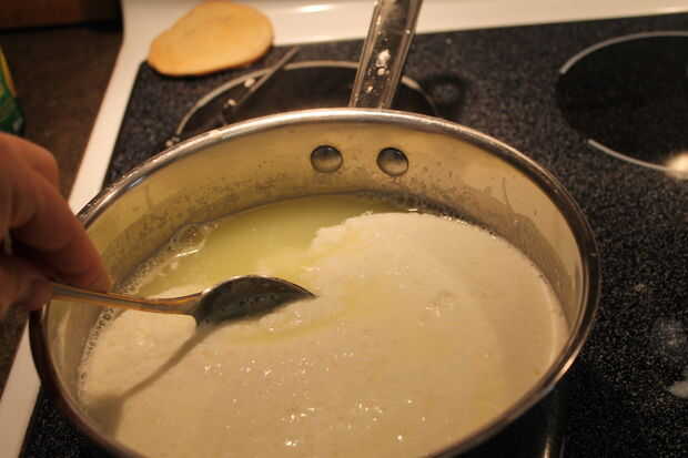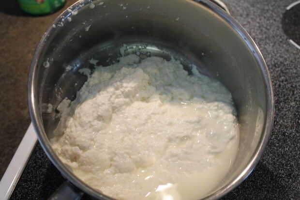 Ahora por alguna razón, mi leche no cuajar tan bien como me gusta, así que mezcle el pote en la estufa a calentar a 180.