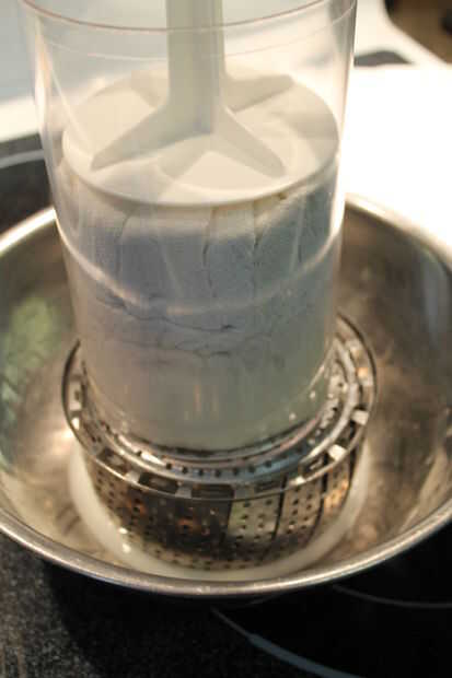 La parte difícil es a veces una vez parte de la tela de queso en la parte superior de la cuajada.  Luego empuje el exceso en el cilindro y la compresa, sacas el suero.  Este flujo aunque el colador de verduras y se recogen en el recipiente.  Tirar hacia fuera el suero y todavía tengo que encontrar un buen uso de ella...