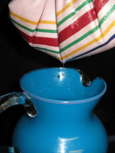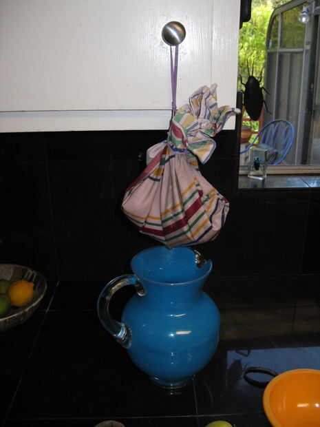 No podía ser más fácil: poner el yogur en una tela de toalla o queso plato y dejar el suero por goteo hacia fuera durante la noche. Había atada mi toalla de plato junto con bandas de goma y había suspendido de un Pomito sobre una jarra. Una vez que la crema de queso y suero de leche se separan, raspar el queso crema fuera de la tela con una espátula y sal a gusto. Suero refrigerado durará meses. En las imágenes, he utilizado yogur de leche de cabra y sal del mar Hawai Alaea roja, que hace el queso de crema ligeramente rosada. La leche de vaca y sal llano trabajará tanto bien.