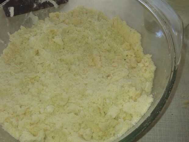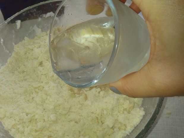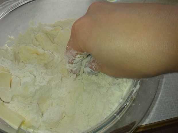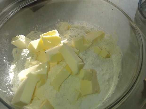 poner la harina en un bol, agregar 1 cucharadita de sal y la mantequilla, cortada en dados pequeños. ahora rápidamente frotar la mantequilla en la harina con los dedos hasta tener una mezcla gruesa, quebradiza.