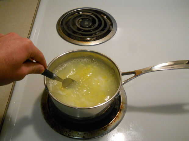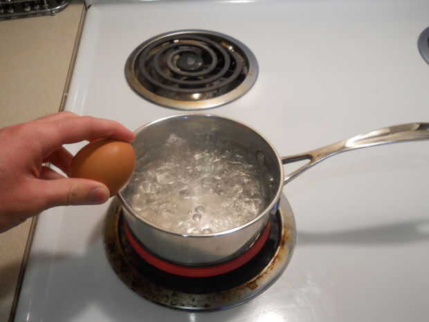 Una vez que el agua esté hirviendo, crack que huevo abra y caer en. Luego, revuelva para arriba con su tenedor. El huevo debe cocinar casi al instante. Por último, reducir el calor un poco y tirar las cáscaras de huevo.