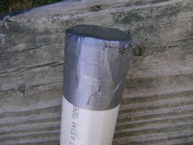 Puede hacer ya sea madera, cartón o tapones de metal, o se puede hacer lo que hice y sólo hay que poner cuatro o cinco capas de cinta adhesiva sobre el extremo y la cinta la sidesdown poniendo una tira de cinta alrededor de la. Sólo colóquese uno al principio para que usted puede llenar la tubería con material pesado. Poner el tapón en después que ha llenado el tubo.
