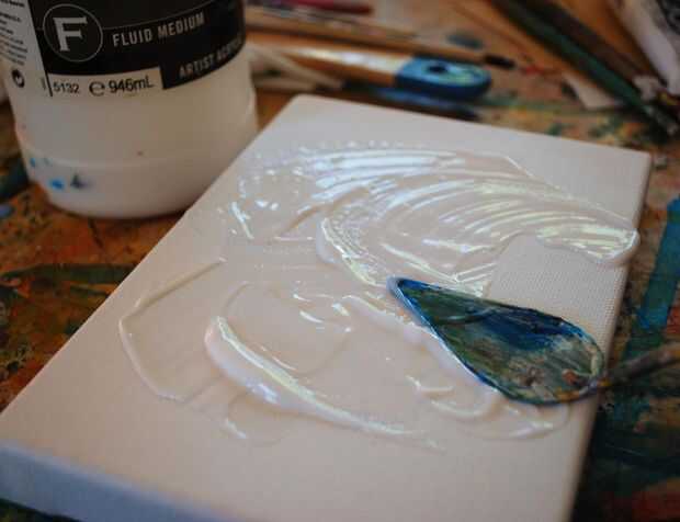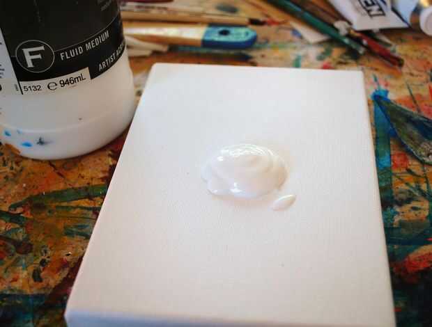 Medio mate acrílico no es brillante y es muy similar a trabajar con un tipo más suave, más flujo de pegamento. Esto es esencialmente "decoupage". Utilice una espátula, pequeño trozo de cartón o cepillo para rápidamente extender una capa de medio acrílico sobre el lienzo. Si está trabajando con un gran lienzo, sólo hacerlo una parte a la vez el medio permanece húmedo.