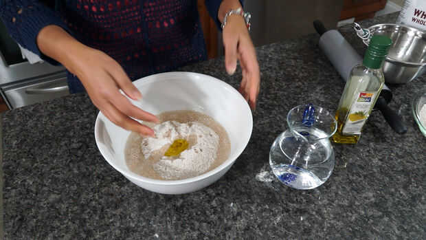 Hacer masa en un tazón mediano por añadir algo de agua y un chorrito de aceite de oliva a la harina y mezclar con las manos. Seguir agregando agua en pequeñas cantidades y mezclando con las manos hasta que todos juntos. Agregar más agua si es necesario para poder amasar la masa hasta que tenga una textura flexible suave (3 a 4 minutos). Reservar la masa a la respiración y ablandar durante 15 minutos. También puede ser hecho por delante y dejar de lado hasta que esté listo para cocinar.