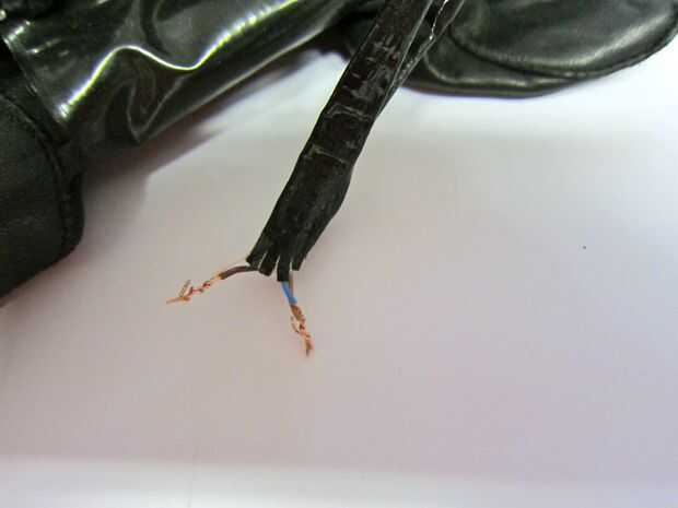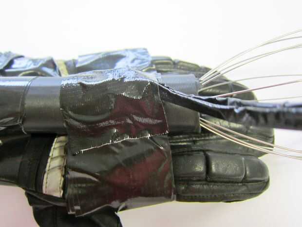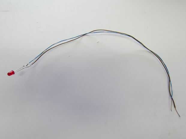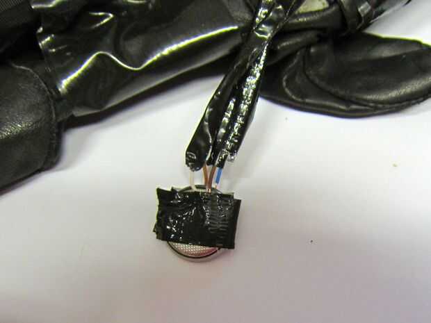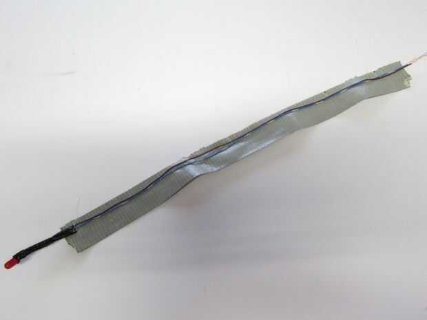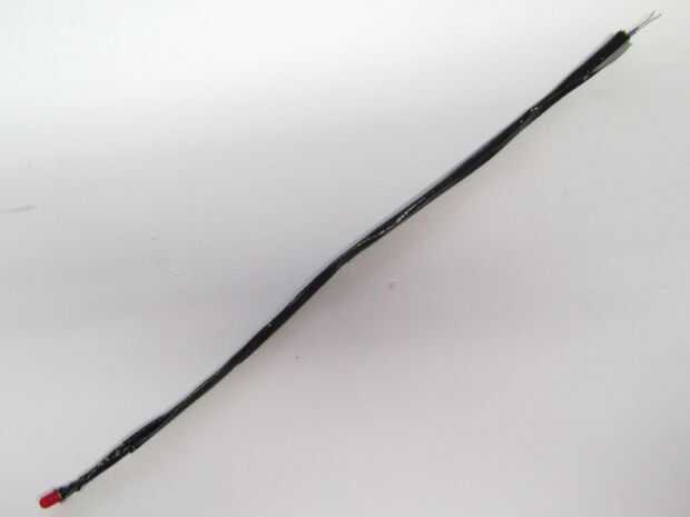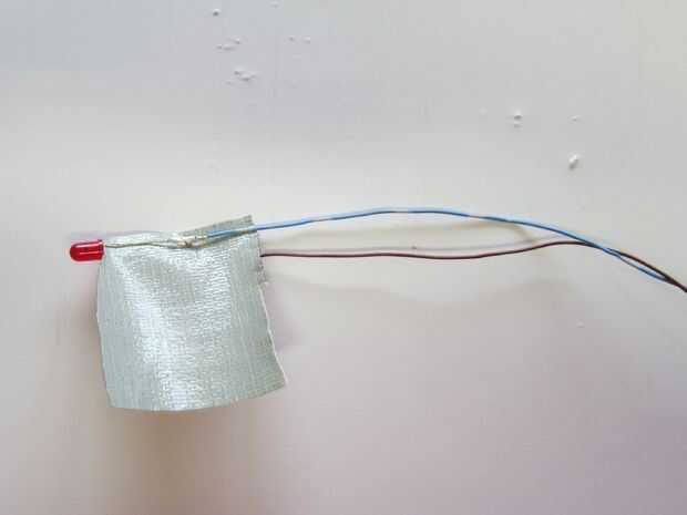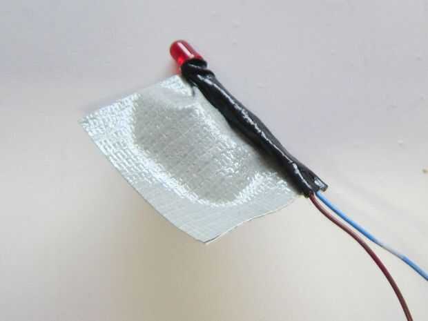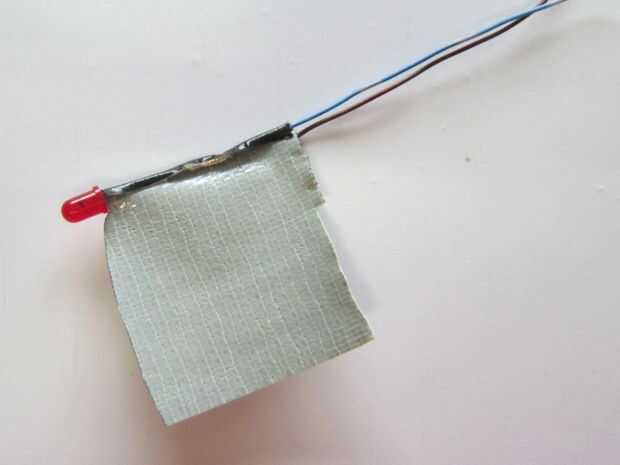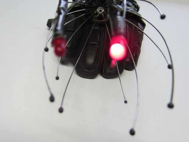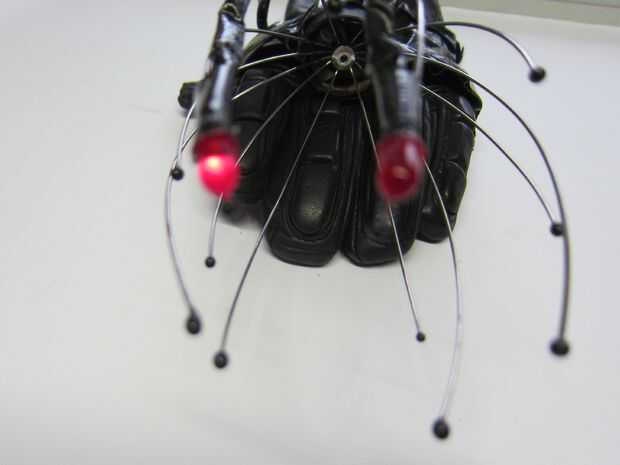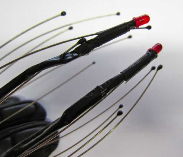 Primero cada una de las patas del LED se extiende por soldadura a un alambre de 25 cm. Para cada LED, las patas en blanco primero están aisladas unos de otros con alguna cinta adhesiva y luego los cables están cubiertos por cinta negra hasta los extremos, cubierto para hacer contacto con la batería. Los LEDs son grabados cerca de los extremos de dos patas adyacentes "araña" del masajeador de cabeza.