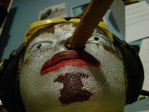 -Optamos por no para hacerlo demasiado sangriento. Gore y el humor no siempre igualan. Accidentalmente agregar demasiada pintura roja al cuello y darse cuenta de que se asemejaría a una amenaza de muerte a recibir.