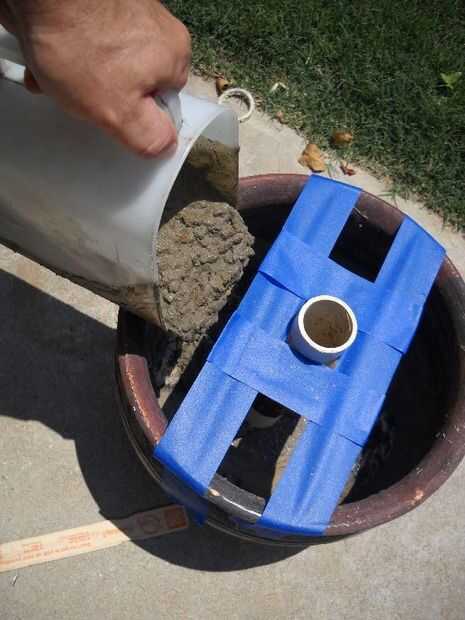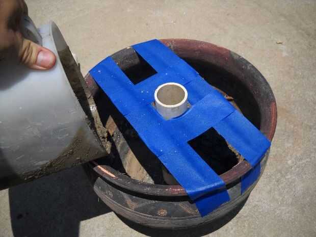 Siguiente va a poner el concreto en las ollas lentamente, teniendo cuidado de no precipitarse. Vierta un poco de cada lado de la tubería.