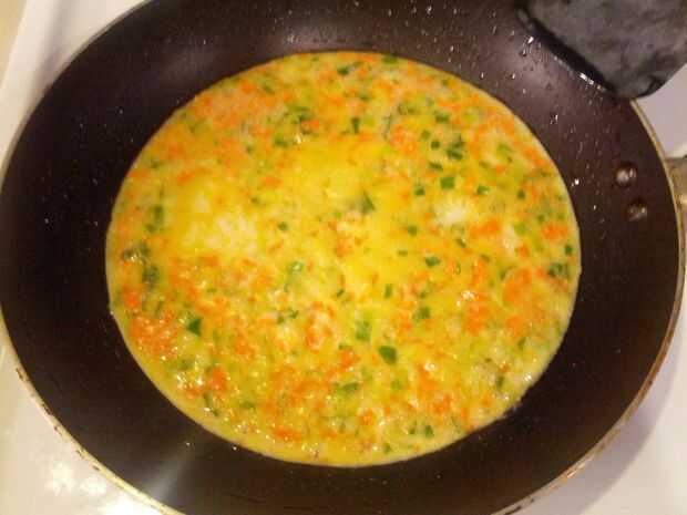 Vierta la mezcla de huevo en la sartén y espere hasta que la parte inferior del huevo esté cocido y firme.