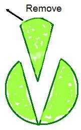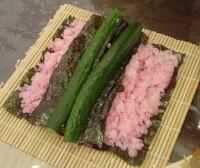Cortar una cuña de pepino como se muestra abajo y colocar el resto del pepino en la superficie de la nori a lo largo de la forma M. Asegúrese de que el pepino se coloca firmemente sobre el nori para que cuando se rodó, no habrá ningún aire.