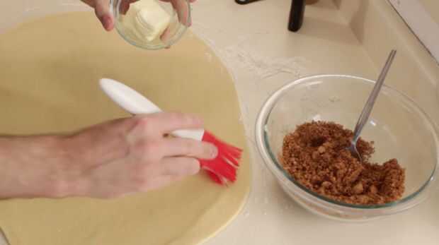 A continuación tomaremos nuestra mantequilla (2 cucharadas) y cepille la parte superior de la masa con la mantequilla. Asegúrese de obtener los bordes. A continuación, añadimos la mezcla de azúcar en la parte superior, puede utilizar la parte posterior de la cuchara para alisar hacia fuera.