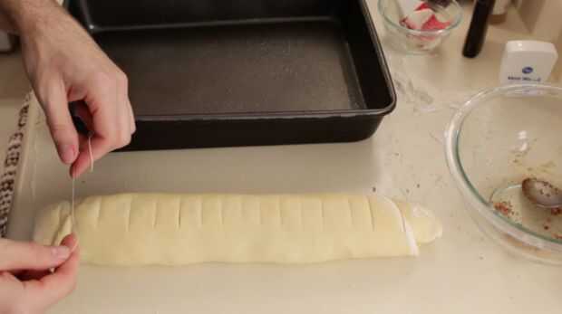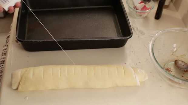 Ahora se trata de un truco aseado para cortar la masa, por supuesto se puede usar un cuchillo, pero me gusta mucho este método. Tomar alrededor de un yarda/metro de hilo dental, poner debajo de la masa donde su marca es y luego cruzarla como ibas a hacer un nudo y tire de cada lado. Cortará a través de la masa, súper fácil.