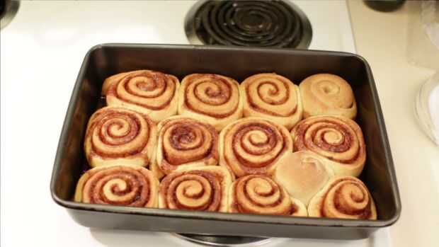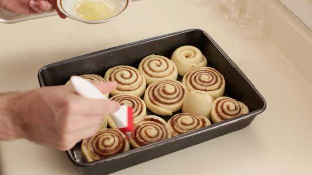Ahora nos cepillo de mantequilla la parte superior de los rollos de canela, para añadir sabor y ayudarles a marrón. Luego hornee en un precalentado a 375 grados F, por unos 15 a 20 minutos, hasta que estén bien y oro marrón en la parte superior.