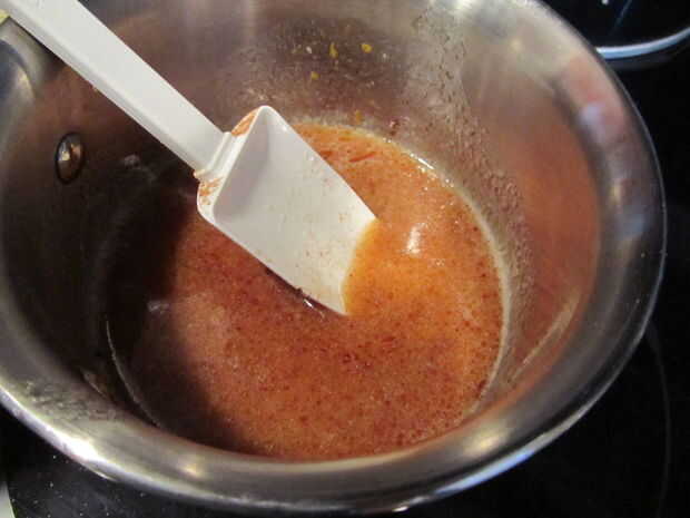 Derretir la mantequilla y añadir la nuez moscada, ralladura, canela y zumo de naranja.