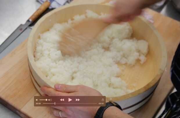 Utilice un arroz corto de grano o sushi y cocinar con agua siguiendo las instrucciones. La relación estándar de arroz al agua es de 1:1.