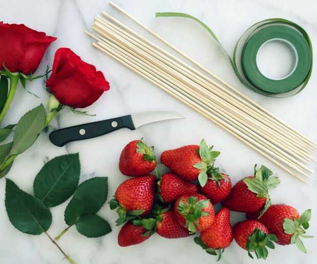 Es una decoración de la mesa romántica y es una entrada deliciosa comida todos enrollada en uno :-) Y además es bastante fácil de hacer!Paso 1: materiales Te hace falta:Un vasoPalos de barbacoaFresasCinta de su elecciónCinta floralUn cuchillo afilado
