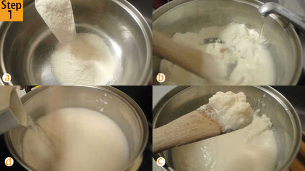 Añadir agua hirviendo y REVOLVIENDO al mismo tiempo con el fin de evitar la formación de grumos, COMO SE MUESTRA EN EL CUADRO PASO 1 D