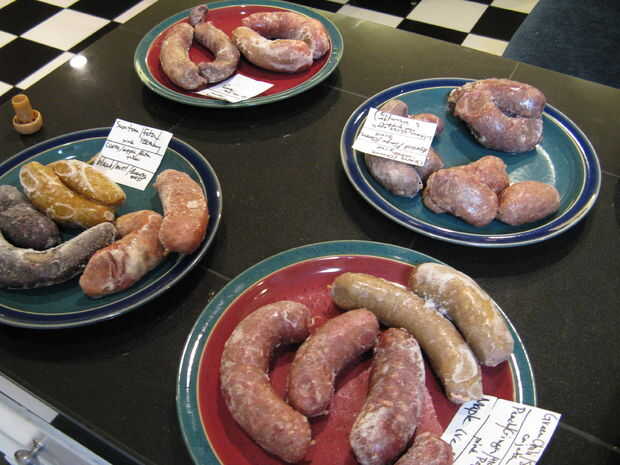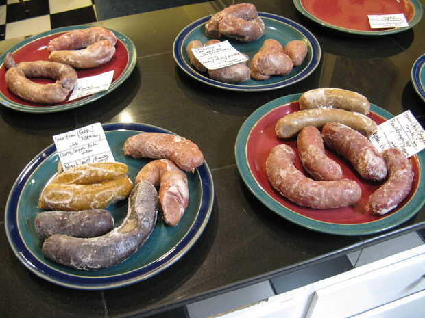 Cocina las salchichas en acero inoxidable y cacerolas de hierro fundidos sobre fuego medio-bajo. Empezamos de sartén para dorar de cada lado y luego añade un poco de líquido (en nuestro caso stock, hecha de los huesos de cerdo) y las cacerolas. Según la pocilga,