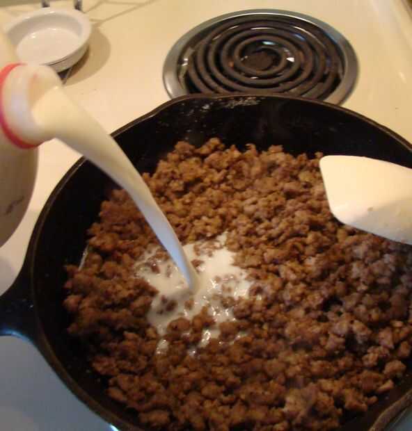 lo que necesita:un panuna estufaspatchula o cuchara1 lb de chorizo, marca de su elección1/4 taza de harina2 tazas de lechealgo de galleta como hacer la salsaPaso 1: Listo su salchicha Primero debes Precalentar una cacerola a fuego medio.  Luego, abre