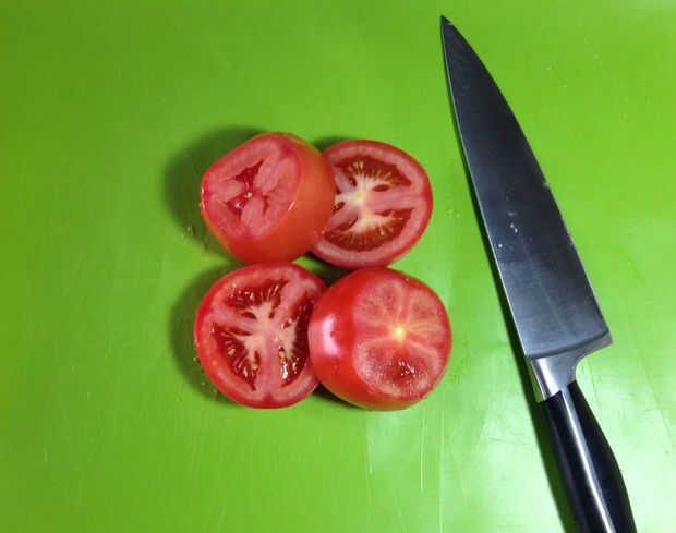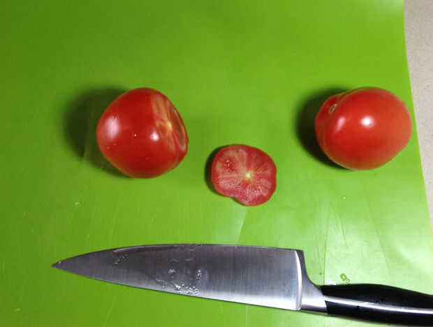 1. Cortar los extremos de los tomates y luego cortar cada uno por la mitad.