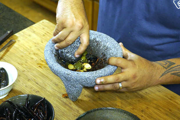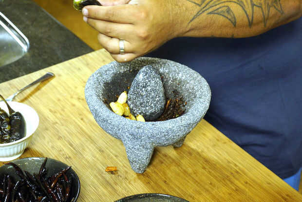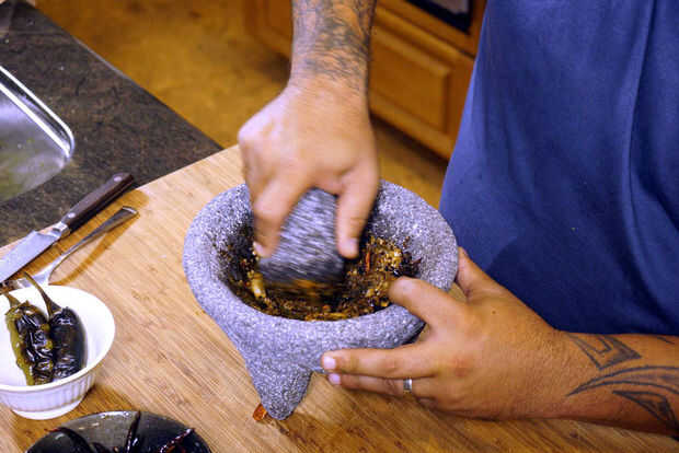 A continuación usted querrá añadir algo de ajo y jalapeños a la mezcla. Carlito se utiliza sobre 5-6 dientes de ajo y jalapeños 3-4 en esta mezcla. Usted puede agregar más o menos, es lo que te gusta. Muela o Licúe el ajo y los jalapeños en los chiles hasta que crea una pasta fina.