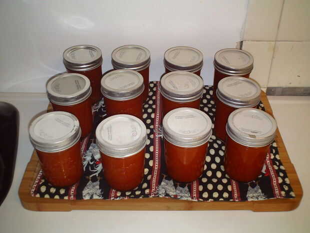 Nota: Esta receta es para 13 frascos de medias pintas. Sólo pude conseguir 11 tarros a la vez dejar el espacio necesario para cada uno. Puse los otros 2 frascos en la nevera y cuando se mantengan durante varios meses sin procesar en el baño de agua. Sin embargo, no va a durar que tiempo ya uno se abrió y la mitad.