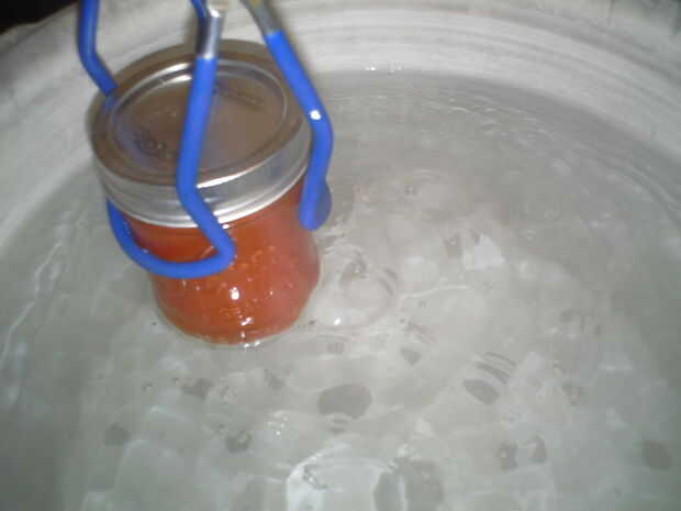 -Con limpieza jar lifter, coloque cuidadosamente los frascos uno a la vez en la olla dejando alittle alrededor de cada frasco. (Ver nota más abajo)