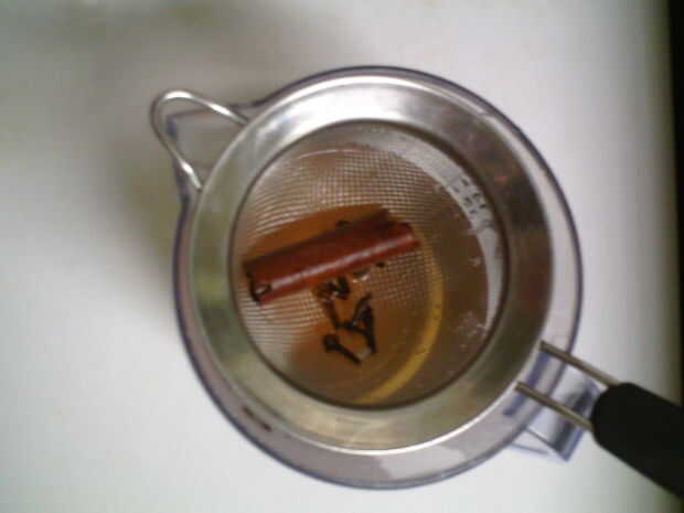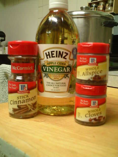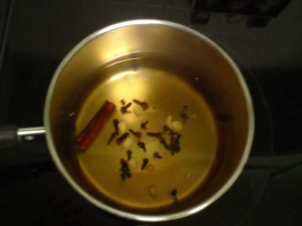 -En una olla pequeña, Agregar vinagre de manzana, canela, clavo de olor entero, pimienta entera y diente de ajo picado.