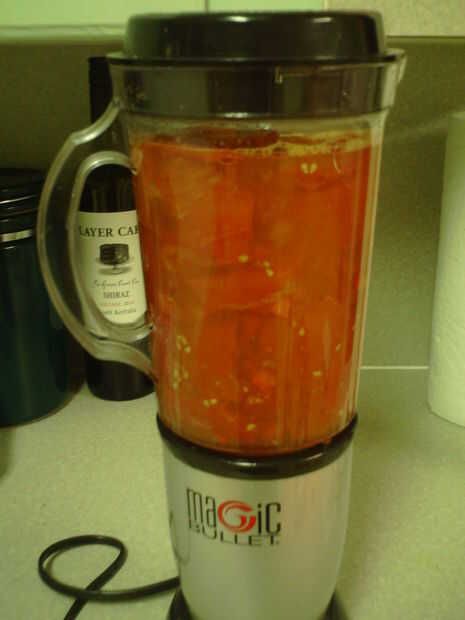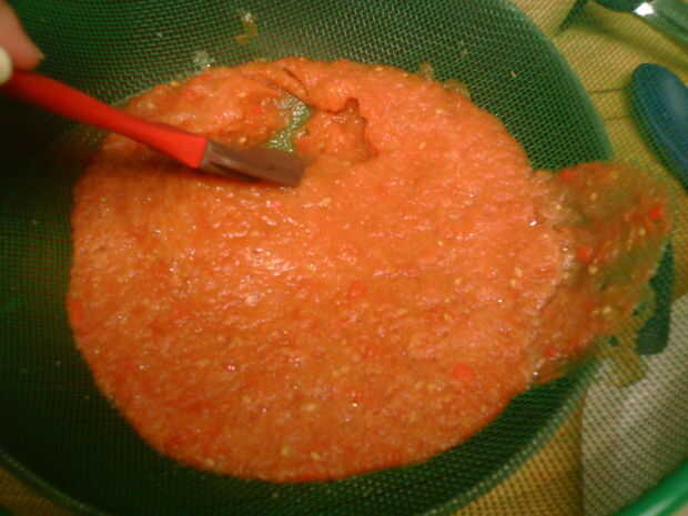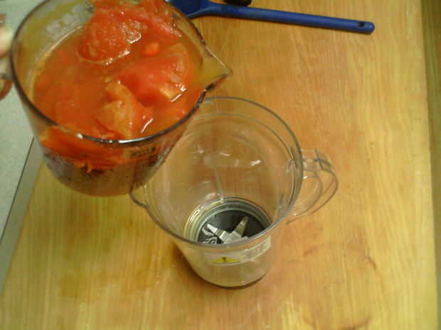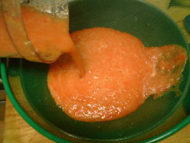 -En lotes, ejecutar la mezcla de tomate a través de una licuadora o procesador de alimentos después del tamiz. Puede utilizar un pasapurés (disco fino) si usted tiene una