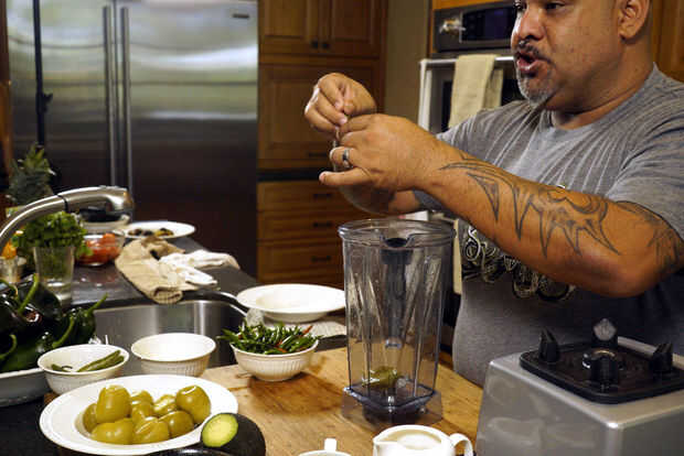ideal para una cena festiva, esta instructable le mostrará cómo hacer dos clases de salsa, roja (rojo) y verde (verde).Se necesita:Tomate SaladetTomatillosPimientos jalapeñosCilantroPimientosApioCebolla blancaCebolla rojaCalLimónPimienta de CayenaCom