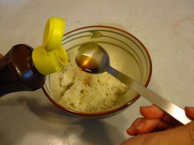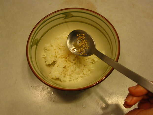 2) sazonar el arroz con 1 cuchara de aceite de sésamo