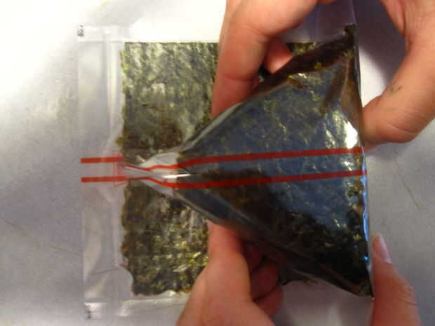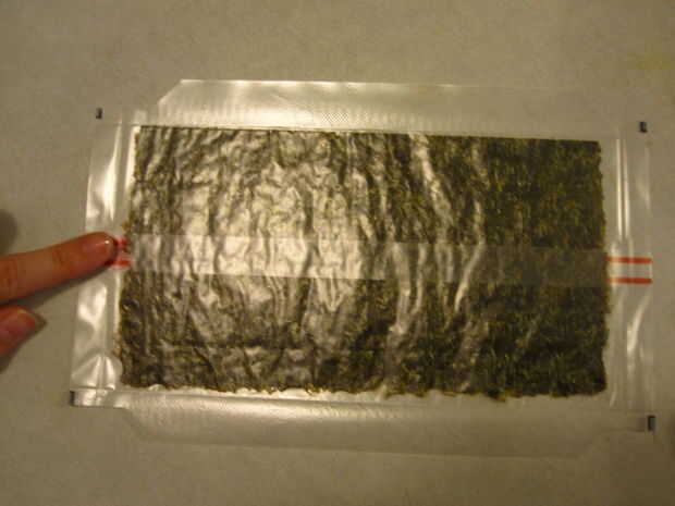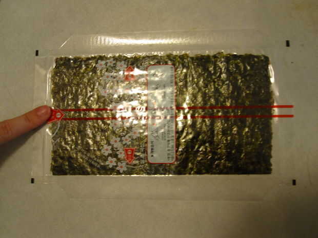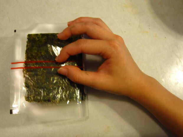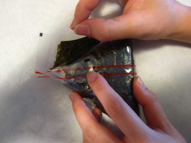 5) doble la hoja sobre el arroz, luego Coloque suavemente en las esquinas superiores de las algas bajo el arroz.